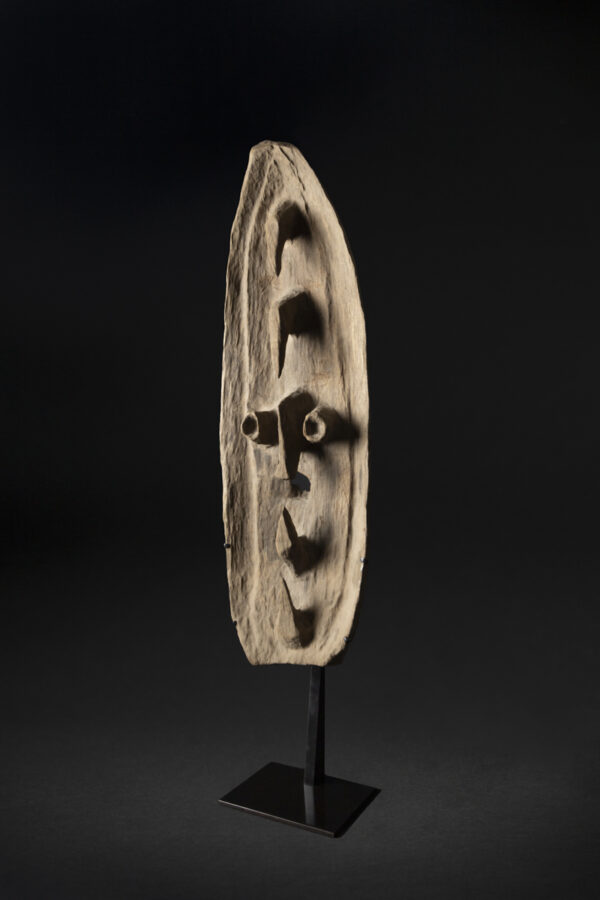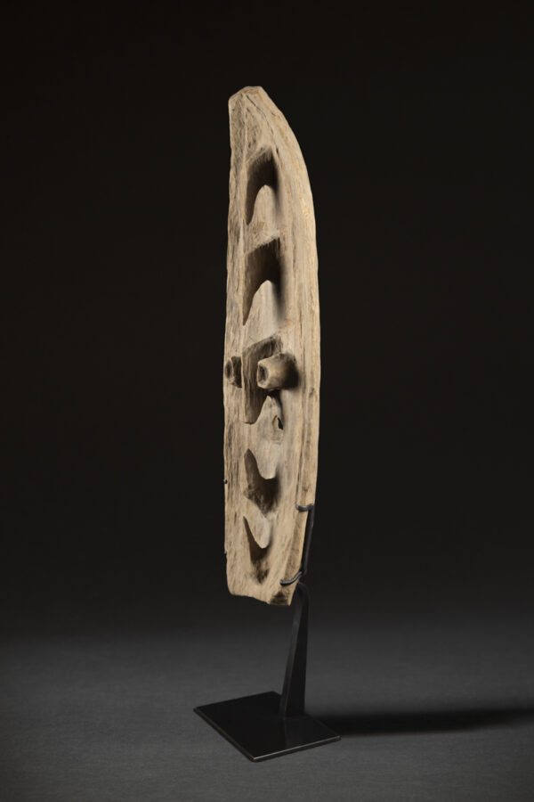 In former times, the focus of artistic and religious life among the Bahinemo people of the Hunstein mountains south of the middle Sepik River was the men’s ceremonial house, in which initiation and other rites took place and sacred objects, collectively called gra or garra, were kept. Bahinemo artists created two distinct forms of hook figures: flat, mask-like panels with stylized human faces bracketed by hook-shaped forms and tall slender images, intended to be seen in profile, consisting of a series of concentric hooks surrounding a central projection. Mask-like forms were associated, broadly, with forest spirits, while the slender profile images were connected with water spirits, their curving hooks identified, in some cases, as catfish whiskers. Like the hook figures (yipwon) of the Yimam people, Bahinemo hook images formerly served as hunting helpers, their supernatural powers assisting in the capture of game. They also played a role in male initiation ceremonies, in which they were carried by initiated men during dances.