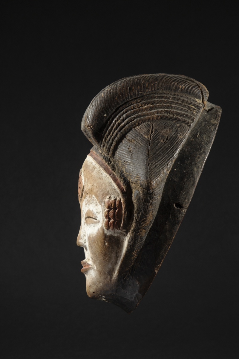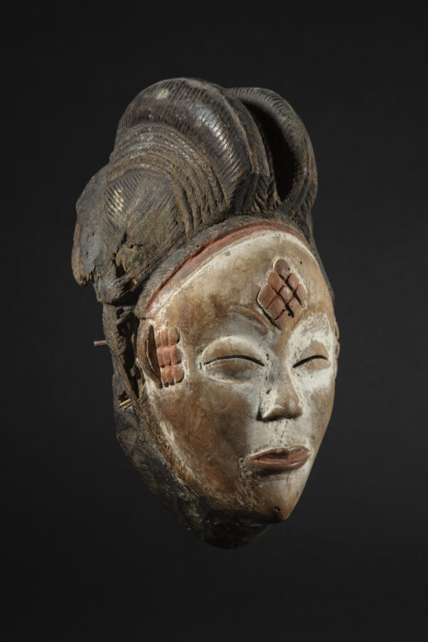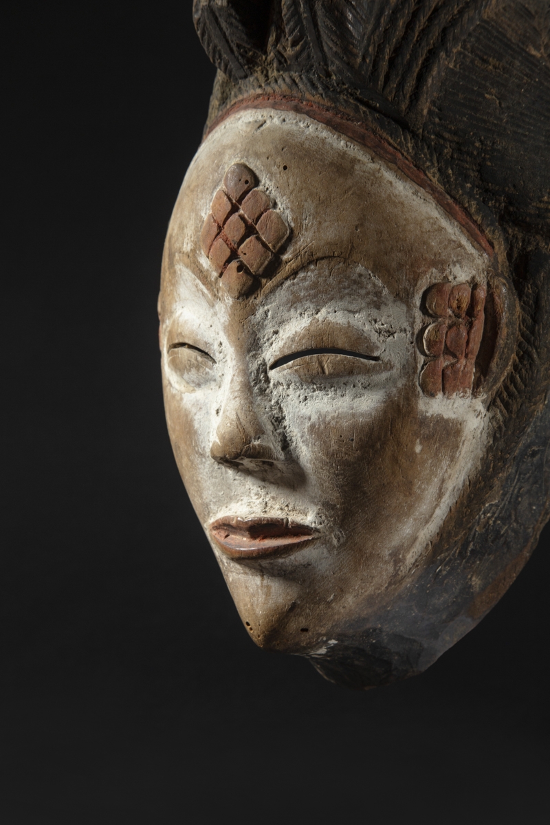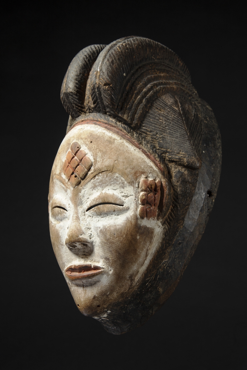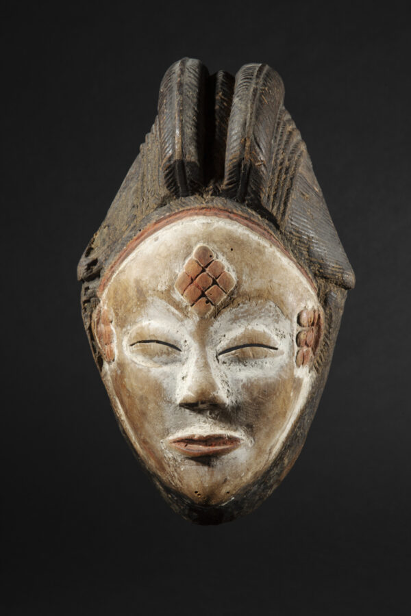 Ce masque rituel M'Pongwe Mukuyi (aussi appelé mukudj ou okuyi) est la représentation idéalisée du visage d'une femme. Alliant expressivité et grâce, il constitue une célébration de la beauté et du pouvoir des femmes Punu. Ce masque rassemble les qualités et caractéristiques des grands masques Punu anciens : une coiffure raffinée et élaborée, des traits délicats et expressifs, un équilibre parfait dans la construction.