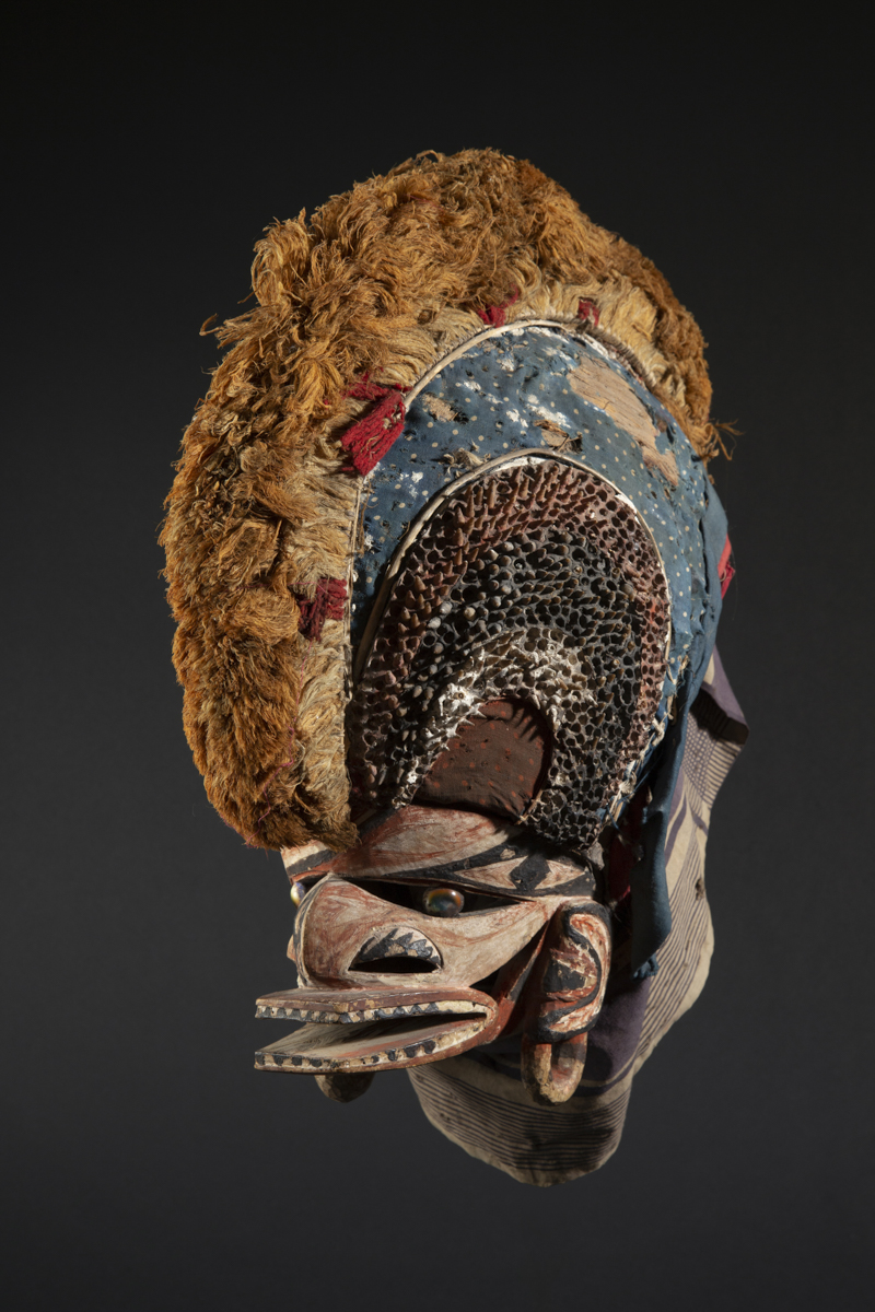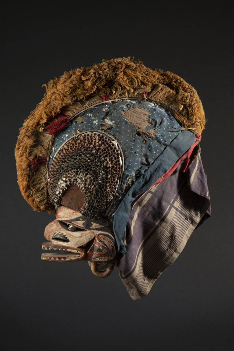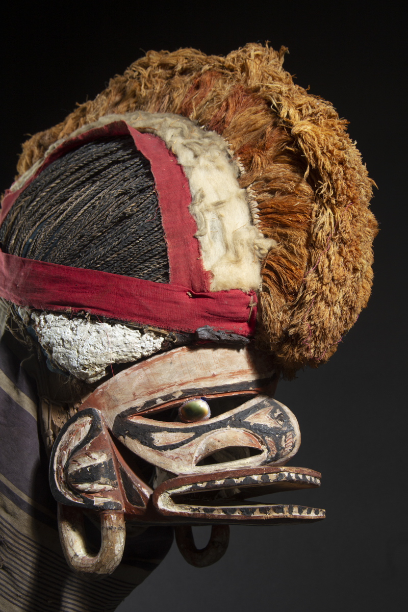 They can be found throughout the northern region of New Ireland, to the north of Papua New Guinea. These masks are characterized by a stylized face with a wide jaw, motifs painted in red, yellow and black, coiffed with a large crest in vegetable fibers. This coiffure probably evokes mourners who shave both sides of their heads.