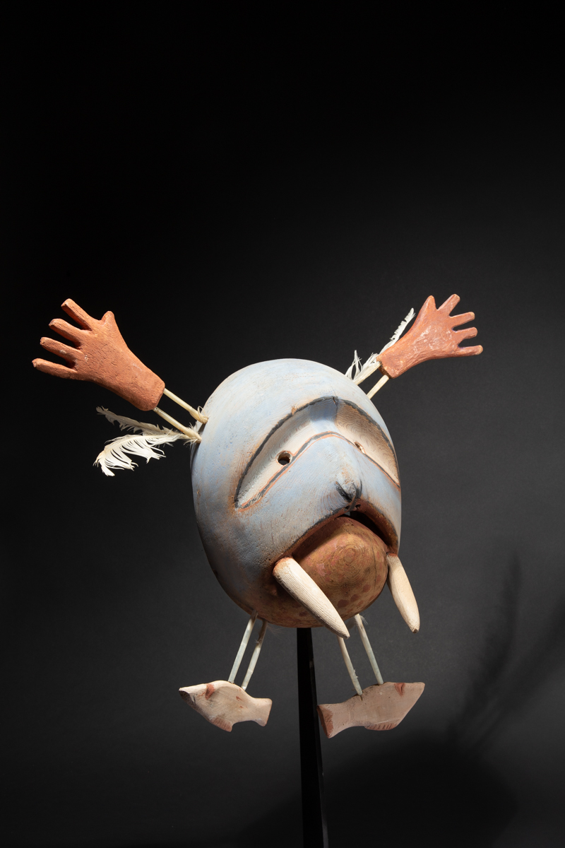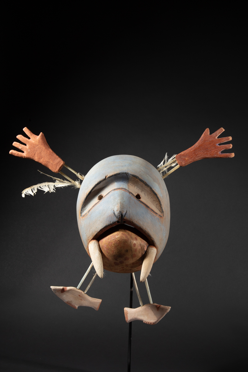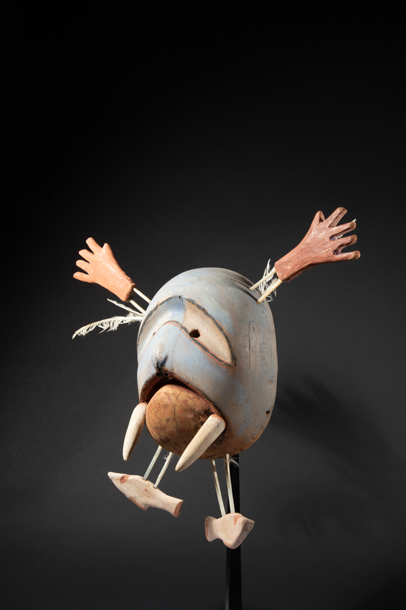 The Subarctic region inhabited by the Yup'ik is well supplied with land and sea resources allowing for much time that could be devoted to a full ceremonial life. After freeze-up in the winter, performance cycles were undertaken that were important to maintaining proper human, animal, and spirit-world interactions. Performed inside the qasgiq (communal men's house) during festivals, dances feature face and finger masks that make visible the world of helping spirits and extraordinary beings, and are specially made to tell particular stories. Often used by shamans to facilitate communication and movement between worlds (human and animal, the living and the dead), Yup'ik masks usually were discarded after use.