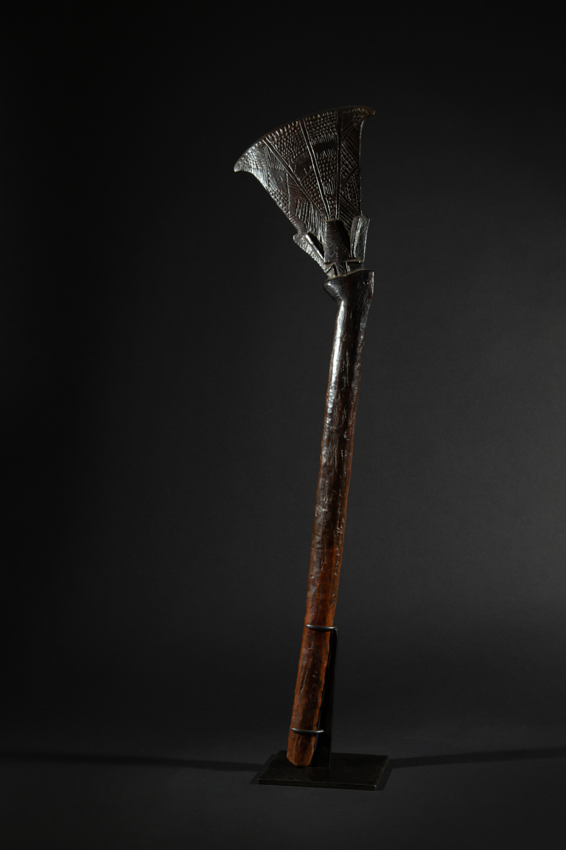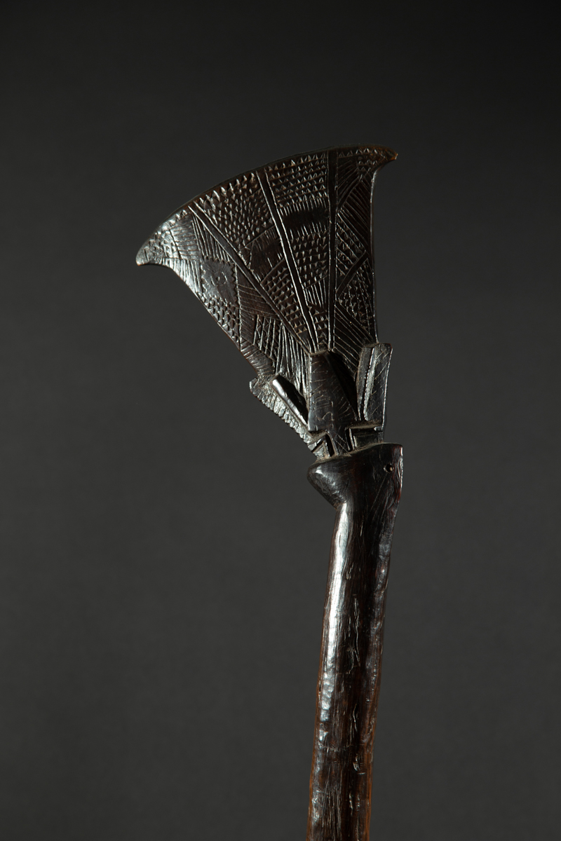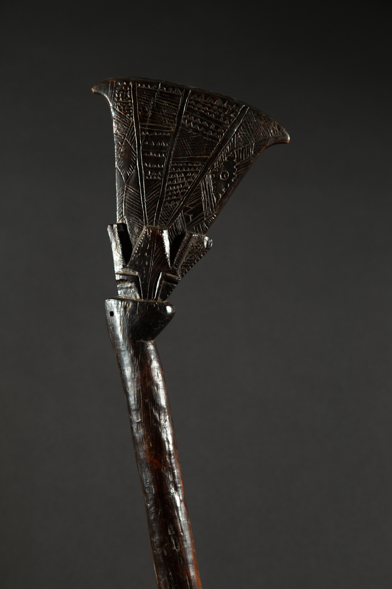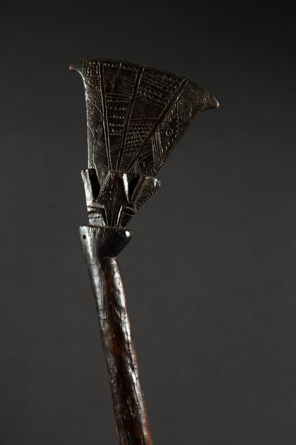 The club here is a very rare example of "Gugu", often improperly described as lotus or axe head club. It is actually inspired by the shape of butterfly fish ("gugu" is the Fijian name of this fish). It seems that these clubs were mainly used for ritual dances rather than fighting.