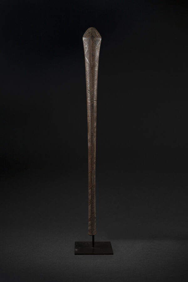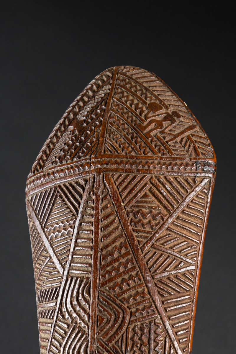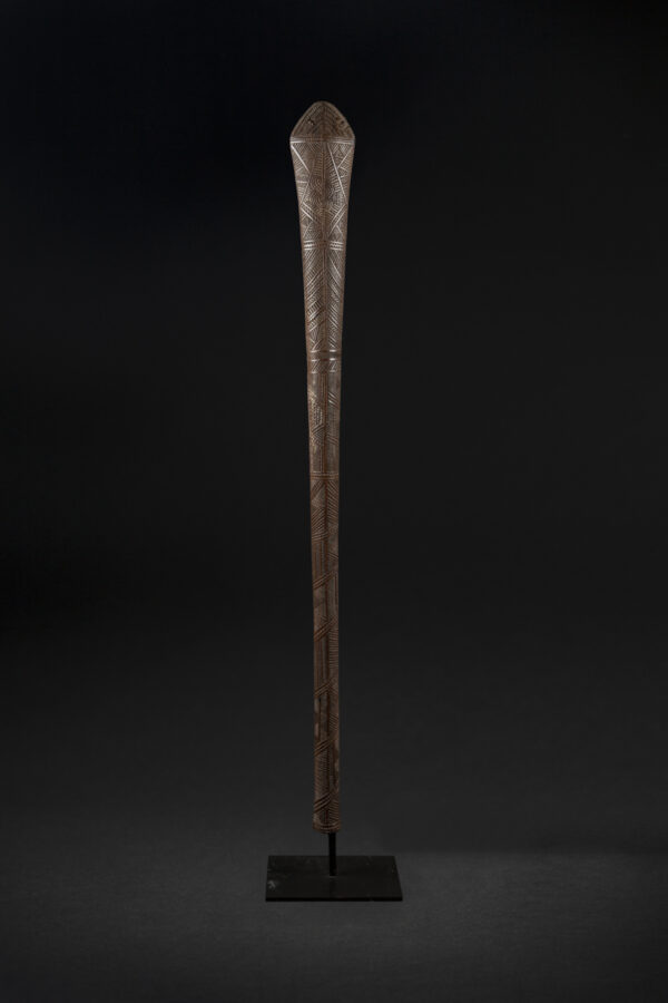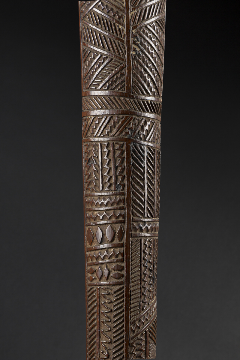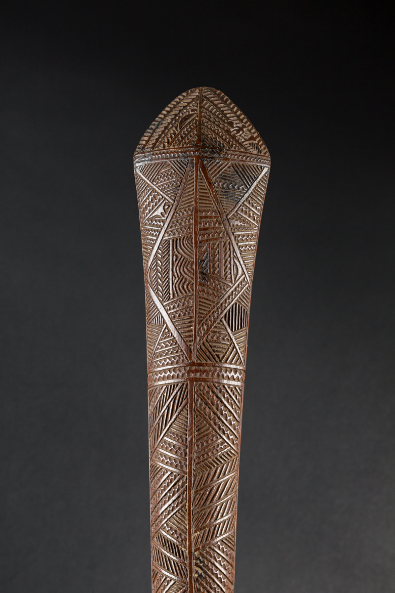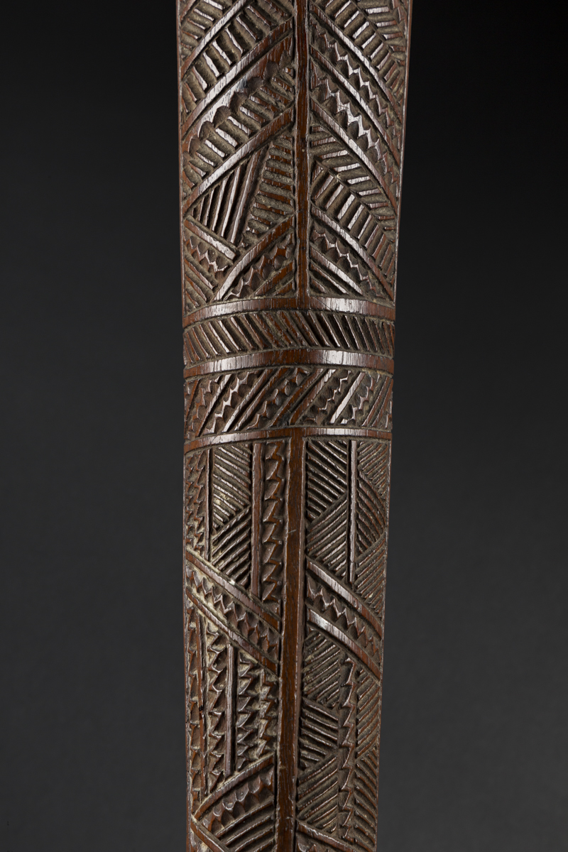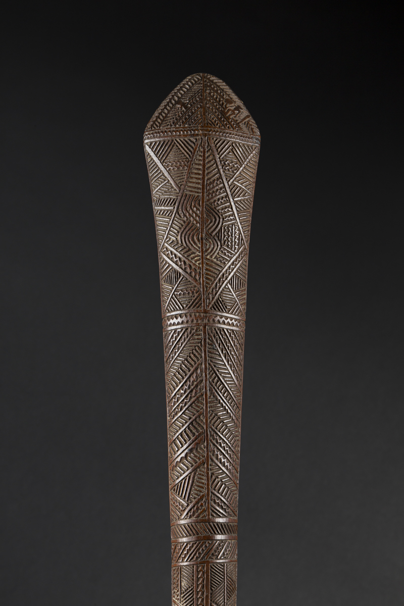 Avant l'arrivée des Européens, les habitants des îles du Pacifique Sud utilisaient des herminettes en pierre et des dents de rongeurs ou de requin pour sculpter leurs massues et pagaies de danse cérémonielles. Dans le sillage des voyages du capitaine James Cook à partir de 1768 puis grâce aux contacts croissants qui se sont développé au XIXème siècle avec les marins occidentaux, les clous et les outils en fer ont peu à peu supplanté les matériaux traditionnels utilisés jusque-là. L’introduction de ces outils a permis aux sculpteurs de gagner encore en dextérité et en complexité dans l’élaboration des motifs.