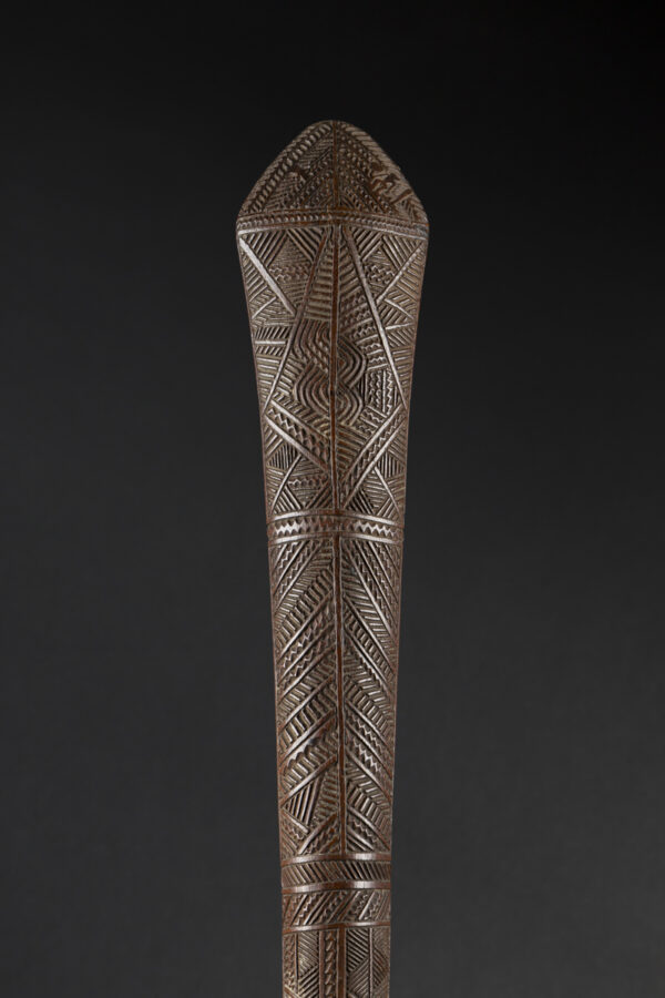 Notons la qualité et la finesse du décor qui recouvre entièrement cette massue et l'harmonie de ses proportions.