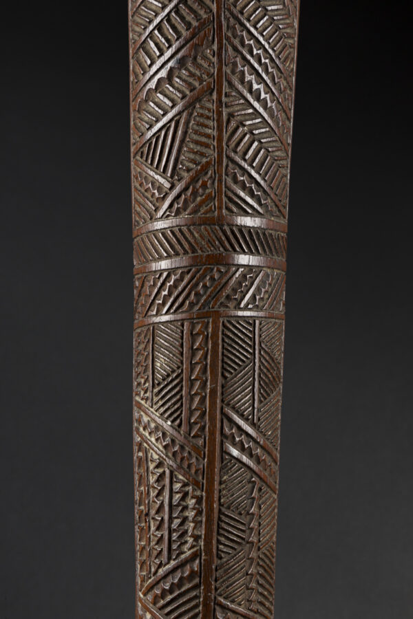 Cette massue est un superbe exemple de massue Moungalaulau très richement ornée. On notera une intéressante mise en abyme puisque certains des symboles principaux représentés figurent des personnages de guerriers portant des massues.