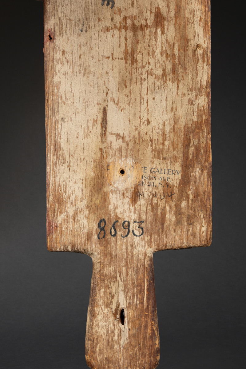 Rare et ancienne palette de danse cérémonielle Hopi figurant notamment le masque de l’esprit Kachina Pooshum (Graine) lié à la germination et en partie inférieure des motifs associés au maïs. Superbes pigments minéraux oxydés par le passage du temps.