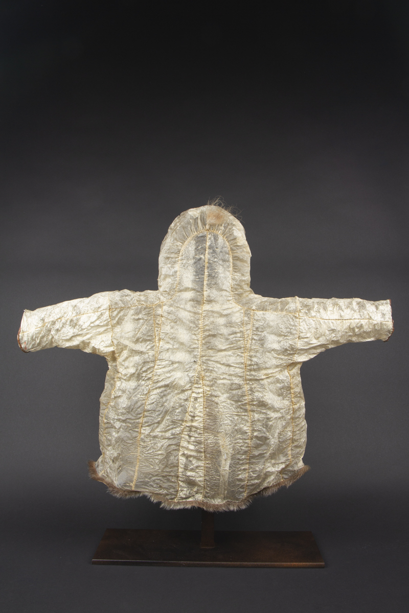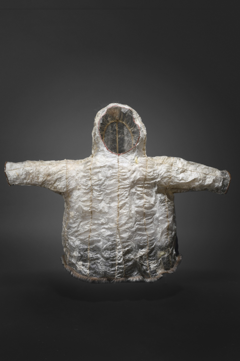 Cette parka d'enfant Eskimo est éminemment poétique. La confection de ces vêtements constituait une prouesse technique, fruit d'un héritage et de savoir-faire ancestraux. Comme l'indique le musée McCord au Canada, les parkas à capuche en intestin de phoque - matière opaque et de couleur crémeuse - était portées par les hommes et les femmes ainsi que les enfants par-dessus d'autres vêtements pour se protéger des embruns ou de la neige. On les portait aussi à des fins cérémonielles.