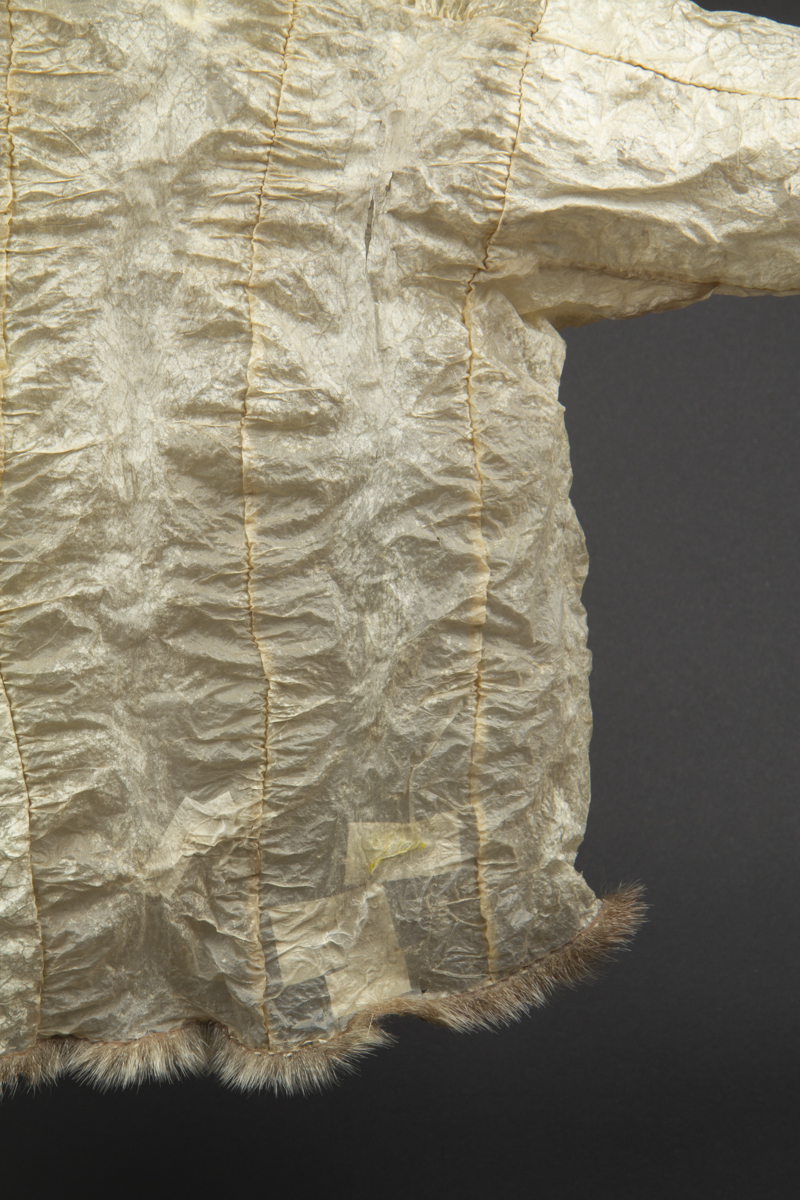 Pour fabriquer un parka imperméable, la couturière inuite coupait les bandes d'intestins selon les dimensions requises et les cousait ensemble verticalement ou horizontalement. Elle utilisait un point de couture imperméable afin qu'aucune partie du vêtement exposée à l'humidité ne soit atteinte. La confection complète d'une parka pouvaitprendre jusqu'à un mois.
