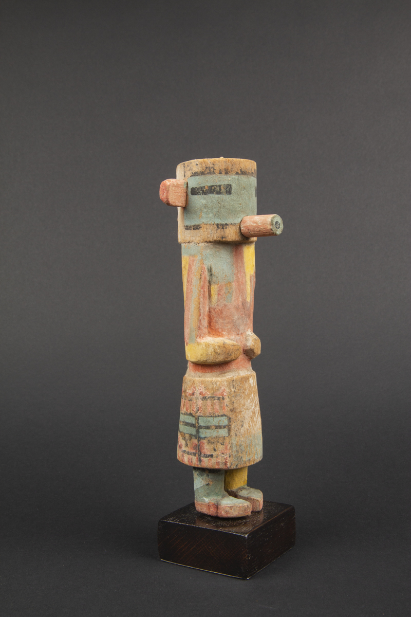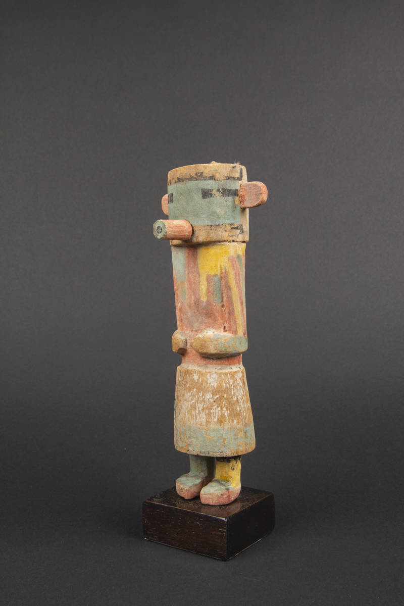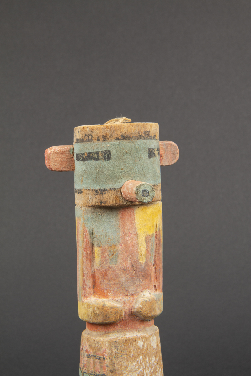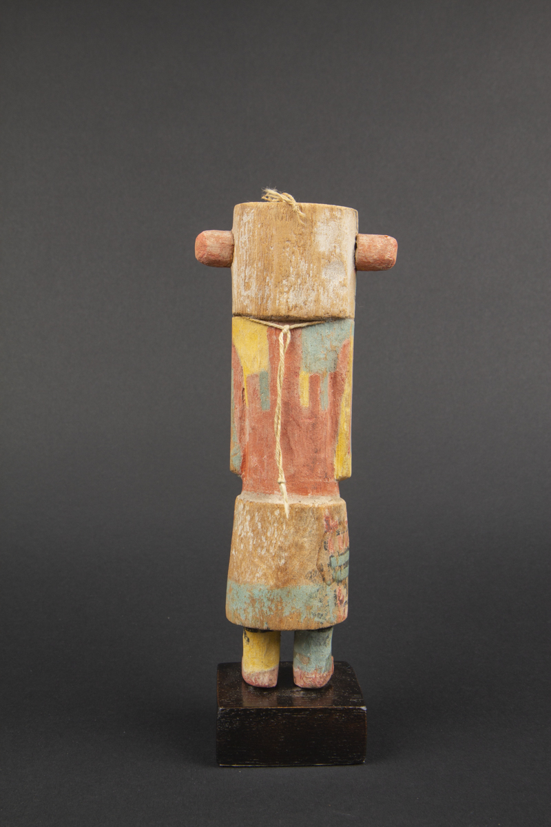 On notera sur cette kachina les très belles couleurs passées et la rare alternance de bandes colorées différentes le long des bras.