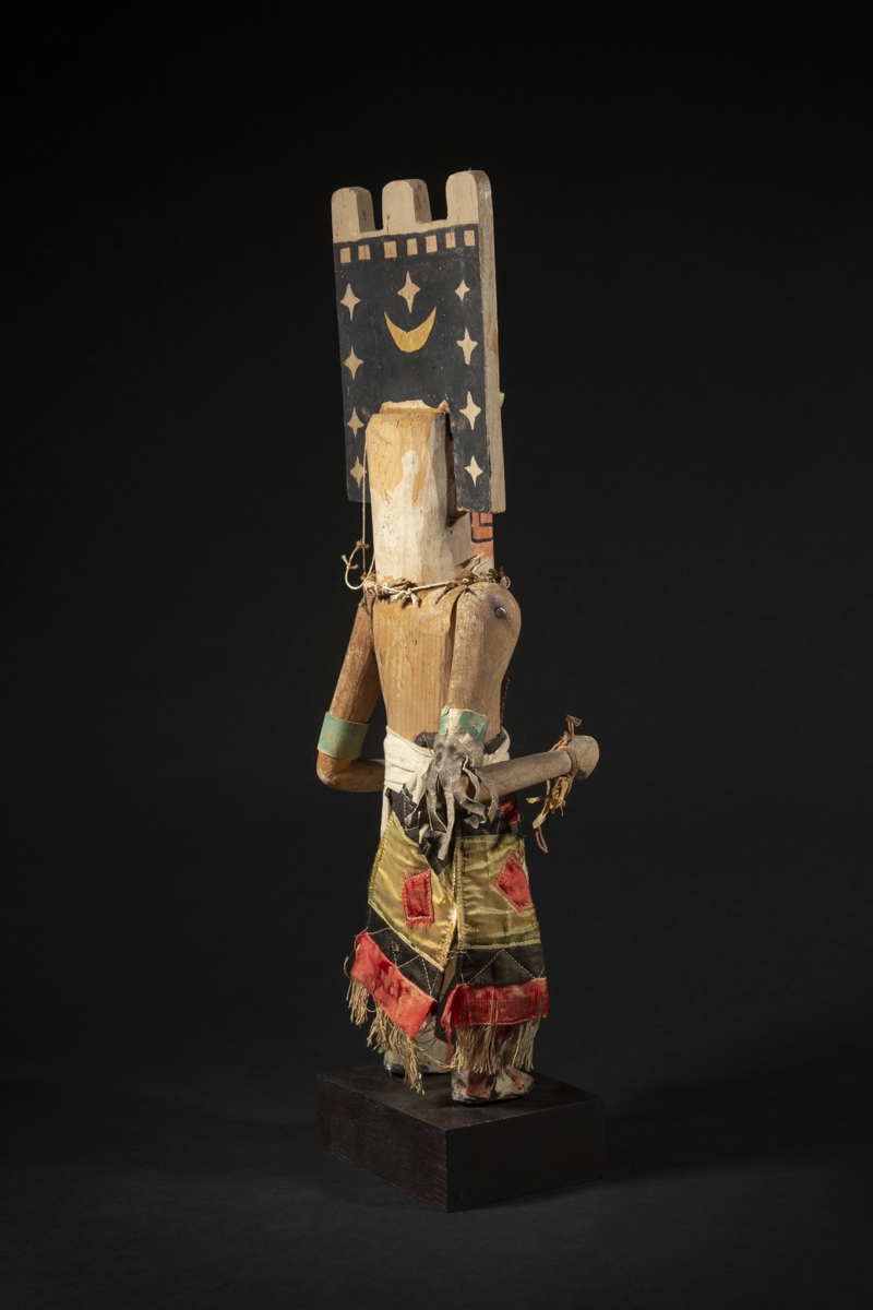This Katsina figure represents Hemushikwe, a Zuni celestial spirit. As indicated by the Brooklyn Museum of Art, which presents a similar example in its collections, Hemushikwe appears on the last day of the Shalako ceremonies at the time of the winter solstice. The performance includes six Hemushikwe dancers, one for each kiva.