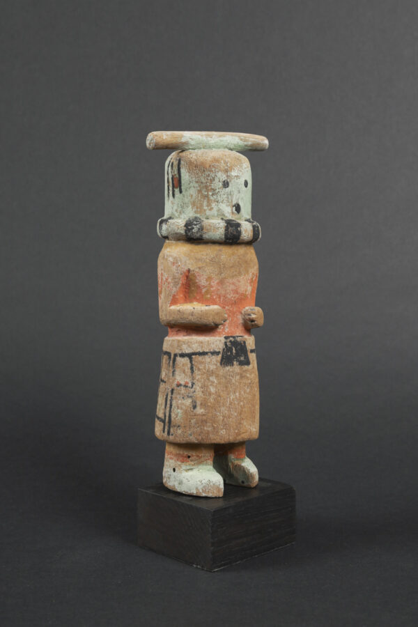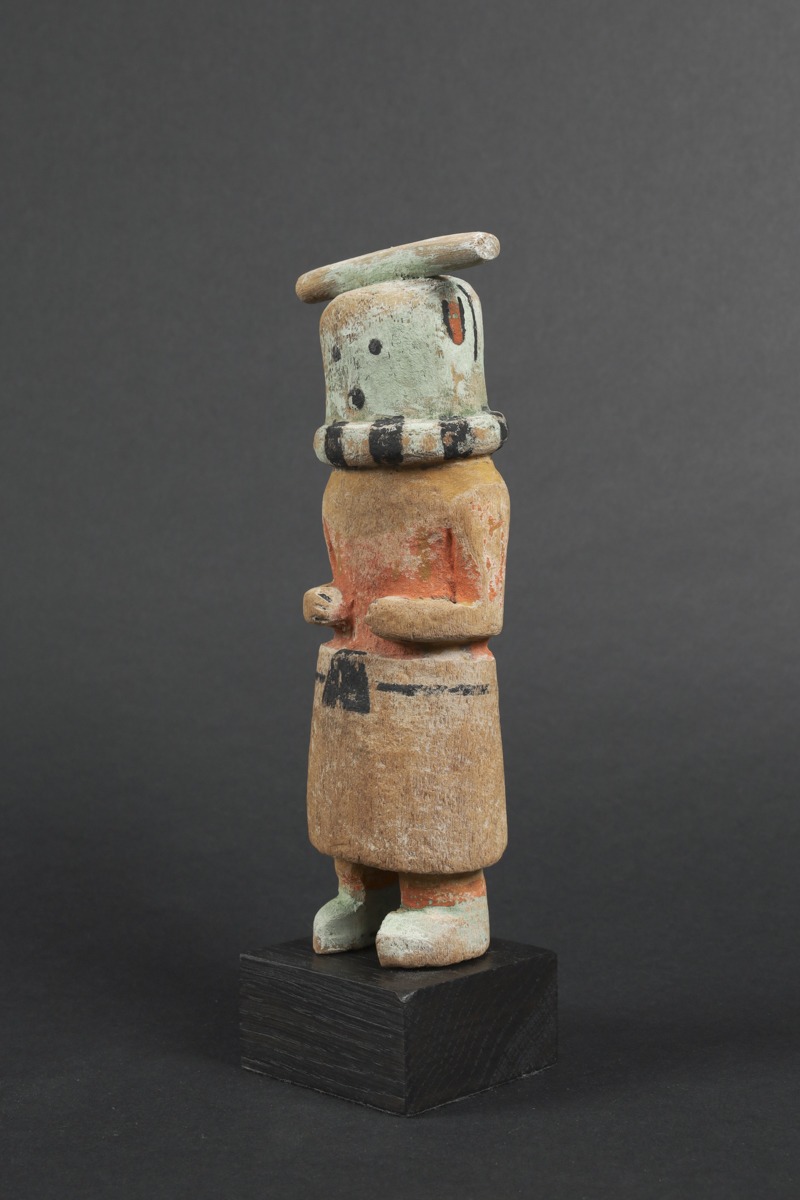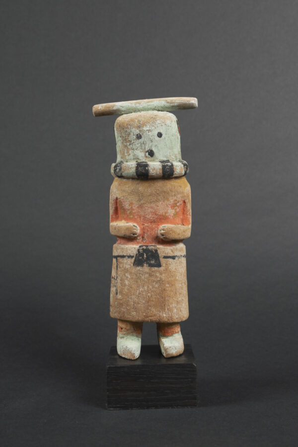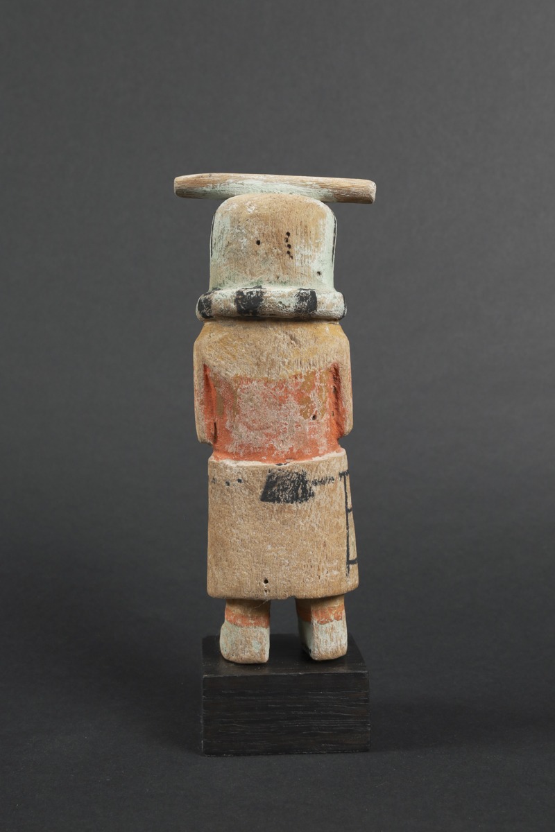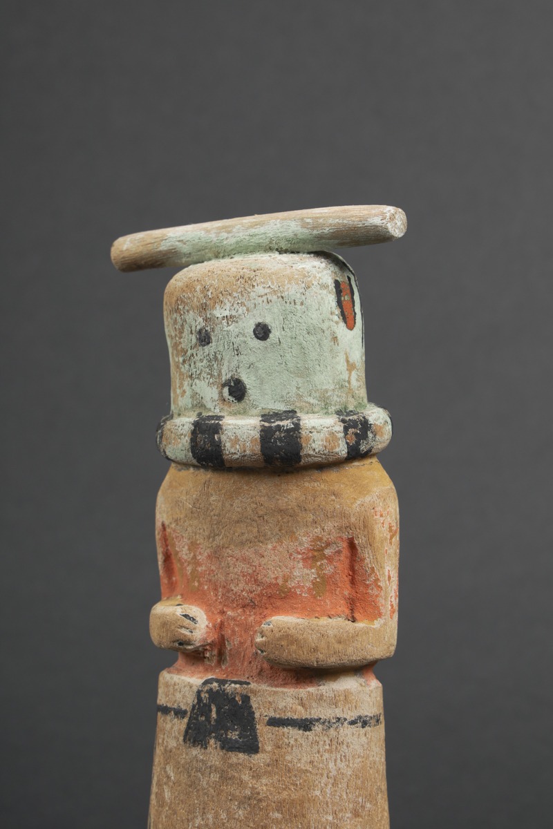 Hakto is a shortened form of the Zuni name Yamuhakto, which means "He who carries wood on his head." On the Hopi mesas, Hakto Katsina appears during Mixed Dances. The colored vertical lines on the sides of the face are said to be sweat marks. This Katsina thus symbolizes effort and labor, reflecting the life of the Hopi dedicated to the hard work of farming the land.