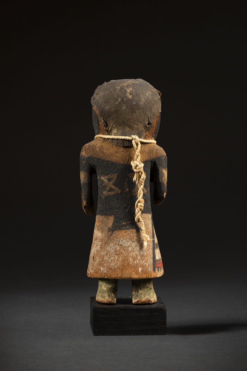 Bois sculpté (cottonwood), pigments naturels, tissu et cuir