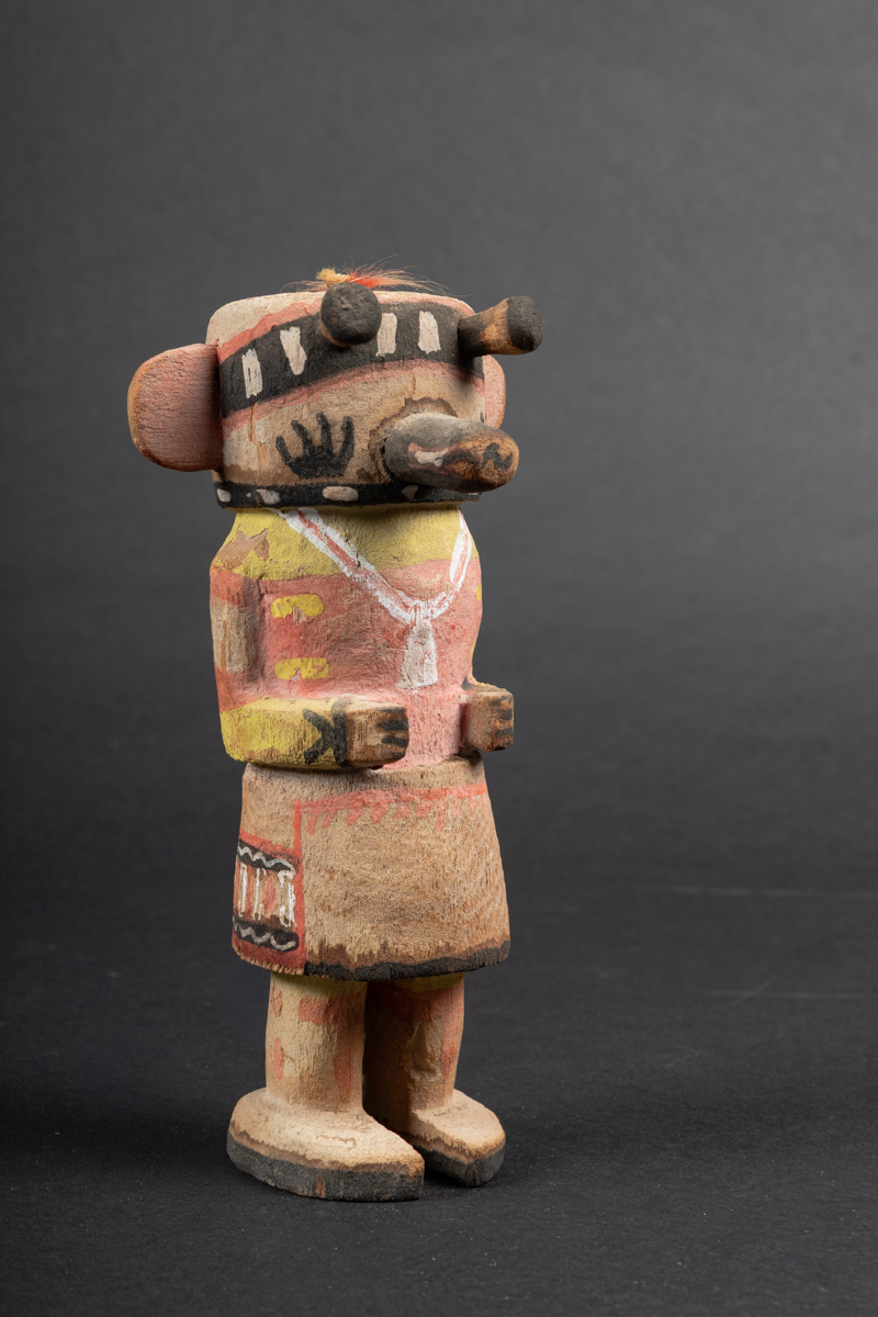 Cette figure sculptée représente l'esprit Kachina du Blaireau (Honan). Originaire de la Seconde Mesa, Honan est considéré comme l'un des Kachinas Chefs. Il apparaît lors de la danse du Haricot (Powamu) en février et à l’occasion de danses d’initiation Kachina.