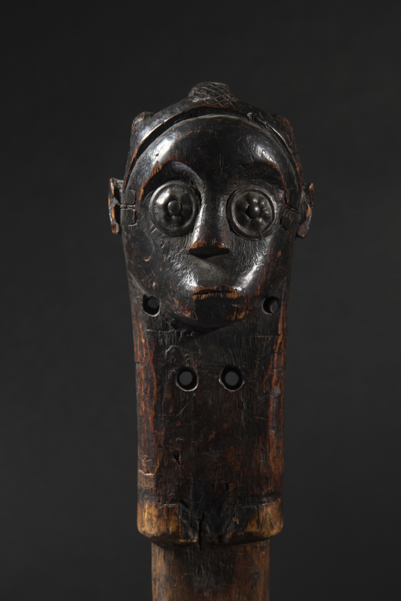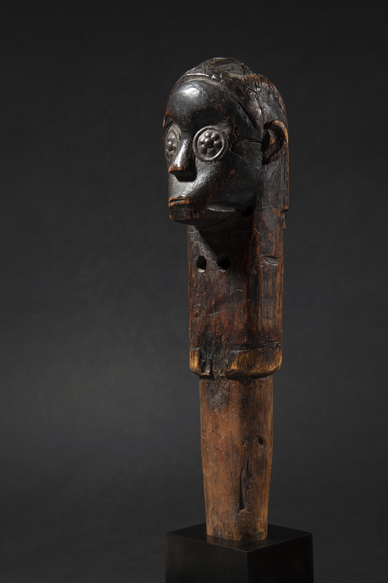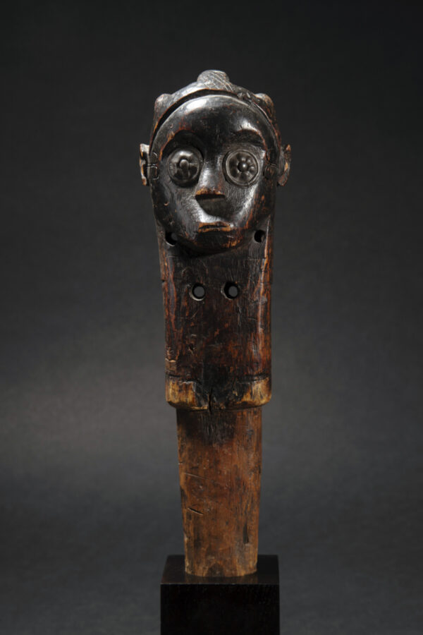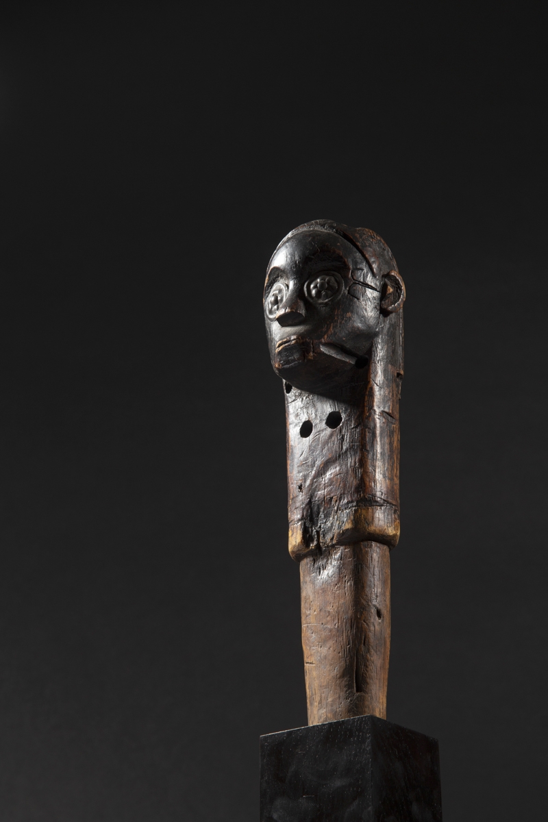 Cette sculpture figurant un visage humain empreint de hiératisme constituait la partie supérieure d’un instrument de musique rituel, la harpe-arquée nommée ñgomi chez les Fang du Gabon.