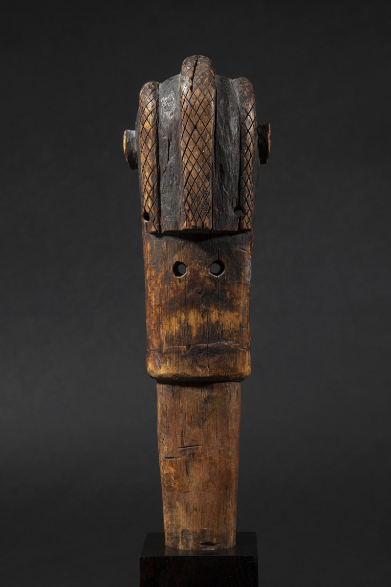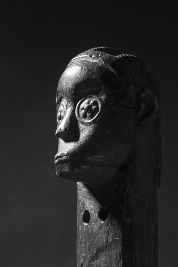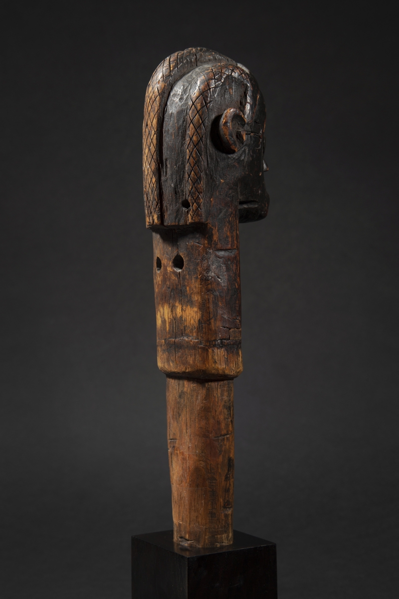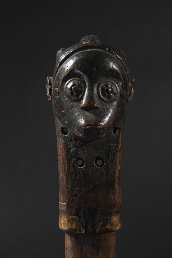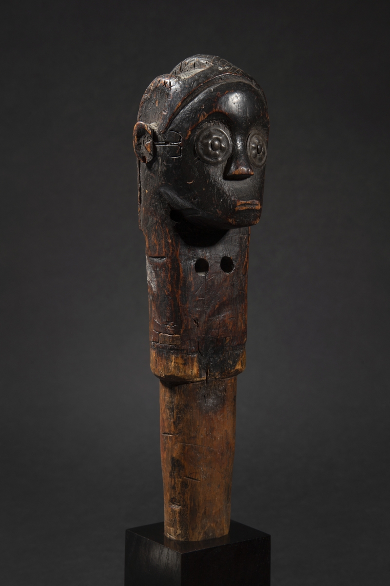 Cette sculpture figurant un visage humain empreint de hiératisme constituait la partie supérieure d’un instrument de musique rituel, la harpe-arquée nommée ñgomi chez les Fang du Gabon.