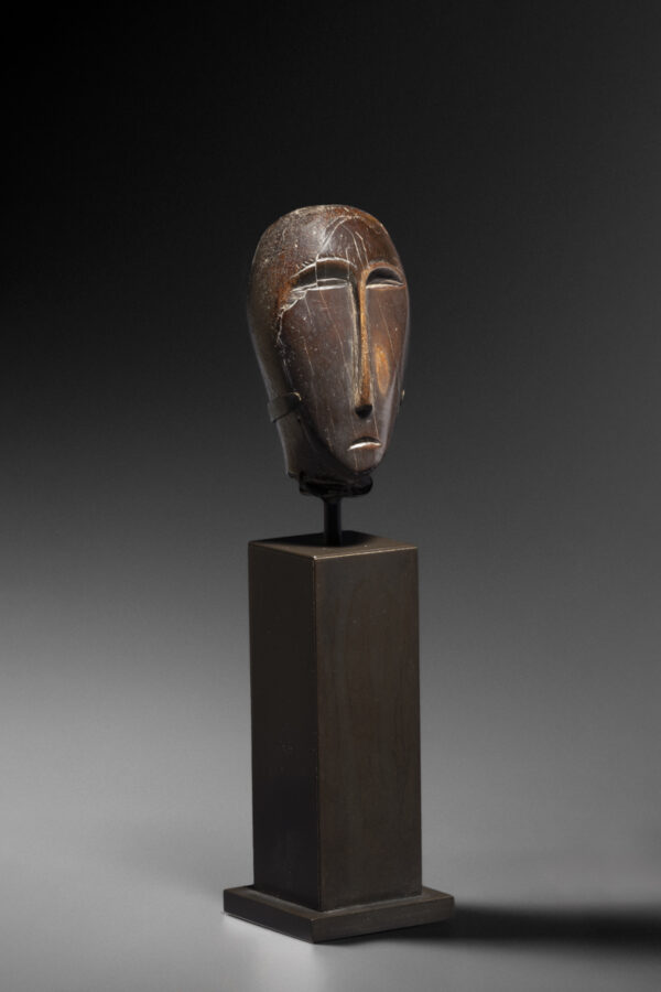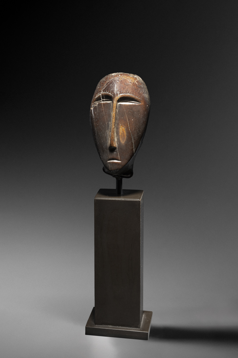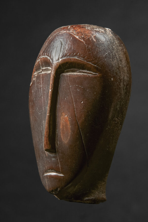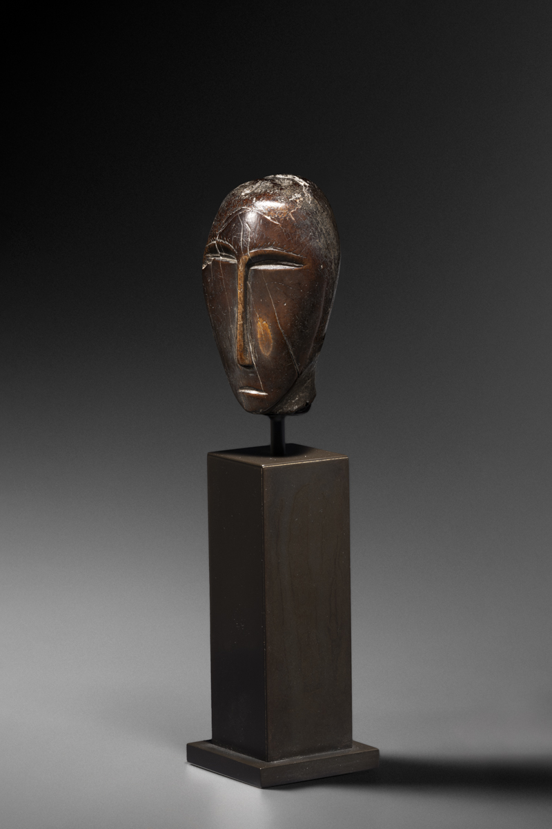 The way in which the features are stretched across the face confers a remarkable elegance and interiority to the sculpture, reminiscent of the art of Giacometti or of Brancusi.