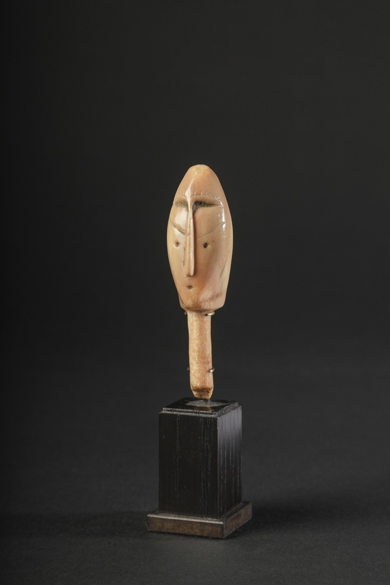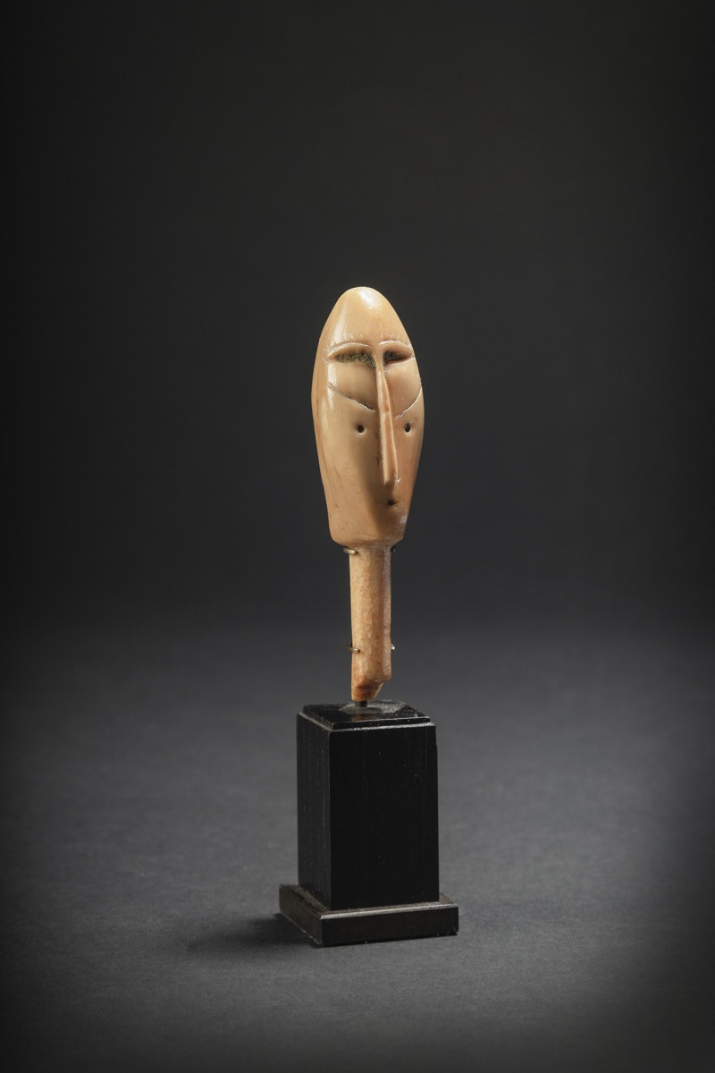 Cette tête au long cou de 7,6 cm de haut, sculptée dans une dent de morse à la patine miel est exceptionnelle par son épure, sa stylisation et l’extrême intensité de son expression qui n’est pas sans rappeler l’art de Giacometti ou de Brancusi.