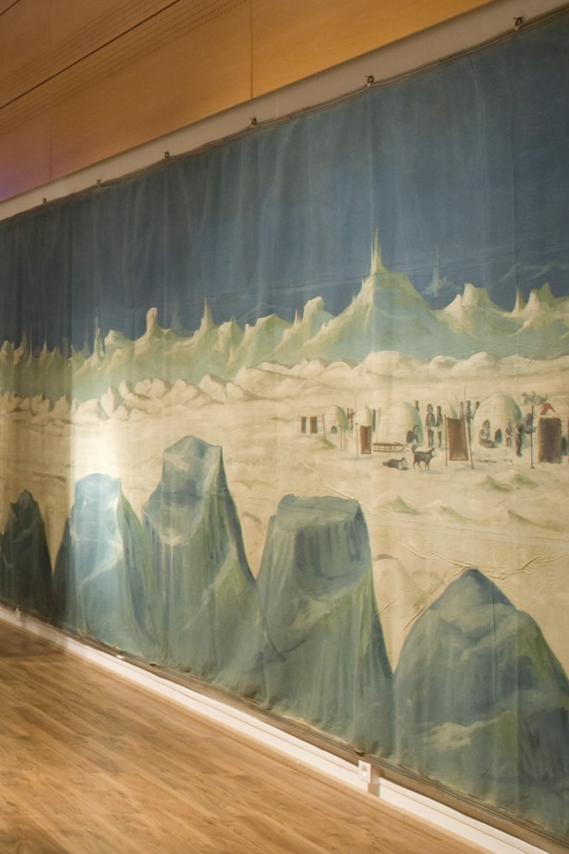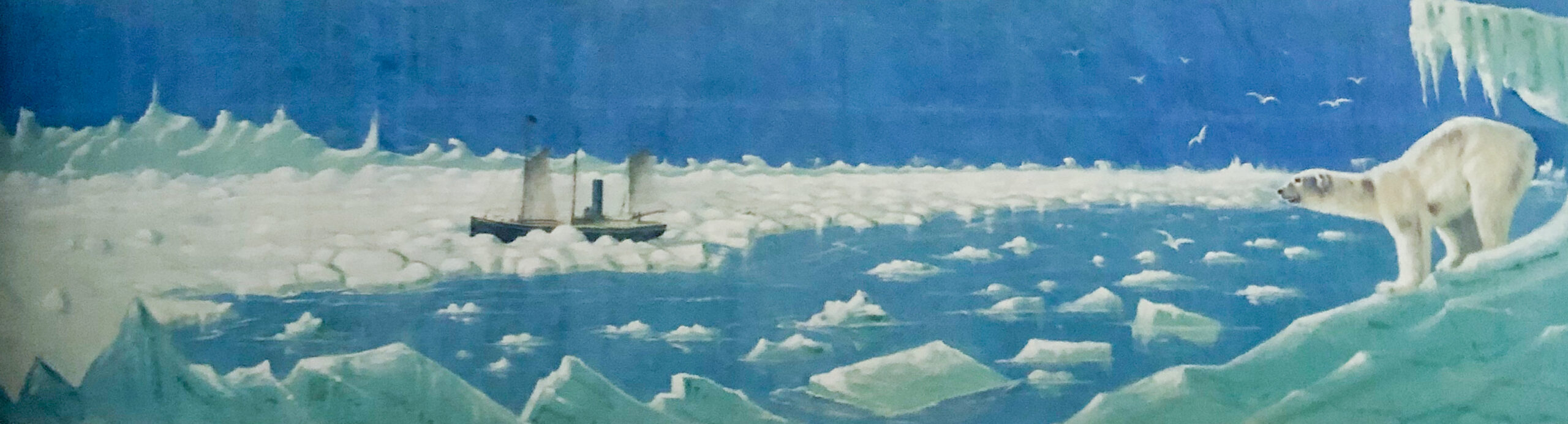 This monumental painted canvas (approximately 22.5 meters long by 2.5 meters high), depicts Peary's voyage aboard the Roosevelt up until his arrival at the Pole.